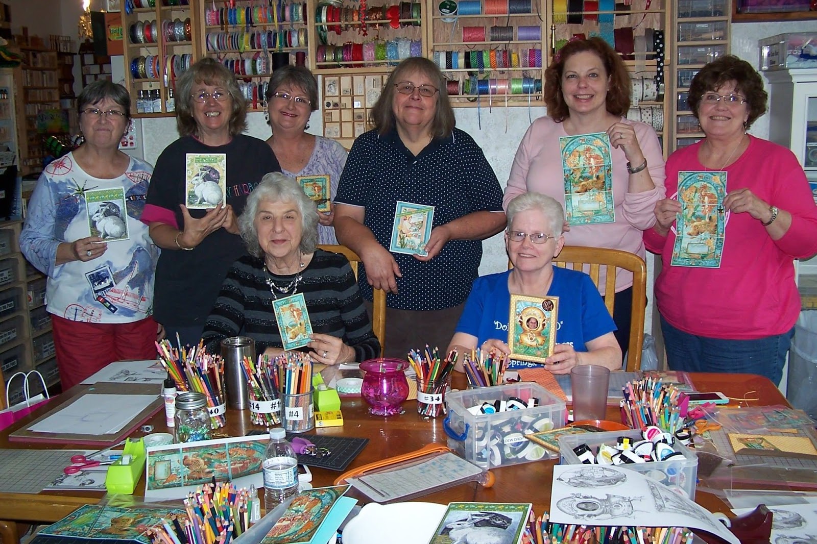 Melanie Page Jensen, Barbara Sowa, Trish Everitt, Sharon Sowa, Kathy Swoszowski, Jeannette Runyon, Carol Desautels and Dorothea Kirkbride Long show off some of the cards they made today in the Graphic 45 card class. I have never seen this group so quiet nor so intent on getting their cards done - GREAT job, ladies!